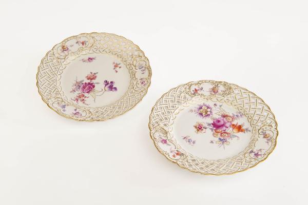 - NOTIZIE STORICO CRITICHE Piatti realizzati presso la fabbrica tedesca di porcellane "Hermann Ohme"; imitano il decoro "Deutsche Blumen" della porcellana di Meissen del XVIII secolo.\n\nHermann Ohme iniziò a costruire la sua fabbrica di porcellana nel 1881 nelle immediate vicinanze della stazione ferroviaria di Sorgau (Solice Dolne, in seguito incorporata nell'area di Szczawienko), sul terreno con l'indirizzo di Waldenburger Strasse 10. Molto probabilmente, i mezzi finanziari per la costruzione provenivano da una parte dell'eredità lasciata da Carl Krister alla moglie di Ohme.\nL'allestimento della fabbrica e la sua messa in funzione furono un compito di Ernst Maria Bauer, un giovane ingegnere. Già nel 1882 la fabbrica era pronta per l'apertura. In origine, gli uffici dell'azienda si trovavano a Walbrzych, in seguito, il 1° aprile 1893, furono trasferiti a Sorgau.\nLa fabbrica di Sorgau iniziò la sua produzione dotata di due forni di cottura. Si stava sviluppando rapidamente e a cavallo tra il 1886 e il 1887 impiegava 250 lavoratori, ma nel 1891 c'erano già 326 persone, tra cui 126 donne. I forni di cottura della porcellana erano alimentati con gas da una ditta del gas che apparteneva alla moglie di Hermann Ohme. Nei primi anni di attività della fabbrica, uno dei suoi collaboratori era Hugo Völker, un modellatore di Plaue in Turingia, che morì a Sorgau nel 1889 all'età di 67 anni.\n\nInizialmente l'azienda offriva servizi da caffè e da thè, stoviglie e servizi per la colazione, nonché porcellana sanitaria di design tedesco, inglese e francese, nonché vasi per fiori, accessori per fumatori, candelieri e altri articoli. Una specialità della fabbrica era la produzione di vasi insolitamente sottili. La fabbrica aveva un proprio studio di pittura e una tipografia. L'attrazione dei clienti e la promozione dei prodotti erano gestite da negozi di modelli e agenzie a Berlino, Amburgo e Londra. Inoltre, la fabbrica di Ohme prese parte alle fiere di Lipsia. Nel 1891 la fabbrica ottenne per la prima volta apprezzamento internazionale quando le fu conferito il diploma onorario di prima classe a Londra.\n\nIl 1° gennaio 1894 Hermann Ohme nominò Ernst Maria Bauer comproprietario della fabbrica nell'ambito di una società in nome collettivo. Nel 1909 alla società si unì Hermann Alfred, figlio di Hermann Ohme, come azionista successivo.\nQuando nel 1895 la fabbrica di porcellana di Carl Tielsch ad Altwasser (Stary Zdrój) lottò per un lungo periodo con uno sciopero dei lavoratori, la fabbrica di Hermann Ohme, insieme alle manifatture di Jaworzyna, Jedlina e Stanowice, dichiarò che per quel periodo erano pronte a fornire a Tielsh qualsiasi quantità di porcellana al costo. Gli articoli contrassegnati con i marchi di Tielsch e Ohme provengono da quel periodo.\n\nNel 1904 la fabbrica di Ohme vinse una medaglia d'oro all'esposizione di Breslavia e una medaglia d'oro all'esposizione mondiale di San Luigi, dove attirarono particolare attenzione le particolari decorazioni smaltate e gli interessanti motivi.\nNel 1907 l'Associazione delle fabbriche tedesche di vasi di porcellana introdusse una classificazione delle fabbriche in base alla qualità e ai prezzi. La terza classe, contrassegnata come la più alta, comprendeva solo otto fabbriche: a parte quattro manifatture bavaresi (CM Hutschereuther a Hohenberg, Lorenz Hutschenreuther a Selb, Philipp Rosenthal a Selb e Kronach), c'era anche la fabbrica di Hermann Ohme. Quando fu introdotta un'altra classe, la quarta e la più alta, la fabbrica di Ohme fu elencata anche lì insieme ad altre dieci fabbriche scelte per questa classe. Un rango così elevato era il risultato del fatto che la fabbrica produceva articoli applicati di vario genere, secondo i disegni creati dagli artisti, e la porcellana era caratteristica per la sua speciale delicatezza e le sue splendide decorazioni, che la rendevano in grado di competere con le principali fabbriche in Germania.\n\nPrima della prima guerra mondiale la fabbrica impiegava circa 400 lavoratori. Le vendite internazionali erano gestite non solo dal grande reparto esportazioni, ma anche da negozi di modelli e agenzie a Londra, Parigi e Smirne. Le agenzie estere dell'azienda attraevano numerosi clienti, poiché prima della prima guerra mondiale la fabbrica era specializzata nella produzione di porcellane di lusso in stile Sèvres e Dresda, che erano di moda a quel tempo.\n\nDopo la morte di Hermann Ohme nel 1921, la società in nome collettivo, che era stata la fabbrica fino a quel momento, venne sciolta. La fabbrica di porcellana e l'impianto a gas adiacente, che appartenevano alla famiglia, divennero proprietà degli eredi. La manifattura rimase sotto la responsabilità di Hermann Alfred Ohme, figlio di Hermann Ohme, e al suo fianco i dirigenti: A. Staedler e Carl Greiner.\n\n(continua in "AN" - annotazioni)\n