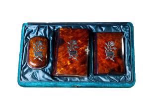 Elegante scatola con coperchio con rivestimento esterno in velluto di colore azzurro, sul coperchio compare un motivo decorativo floreale ricamato, chiusura in lamina di metallo sagomato con decori vegetali incisi; internamente presenta una suddivisione in tre scomparti, due rettangolari e uno ovale, con rivestimento in seta azzurra.\nCustodisce un borsellino, un libro di preghiere e una agendina, tutti con copertura esterna in tartaruga con motivo ornamentale in argento.\n