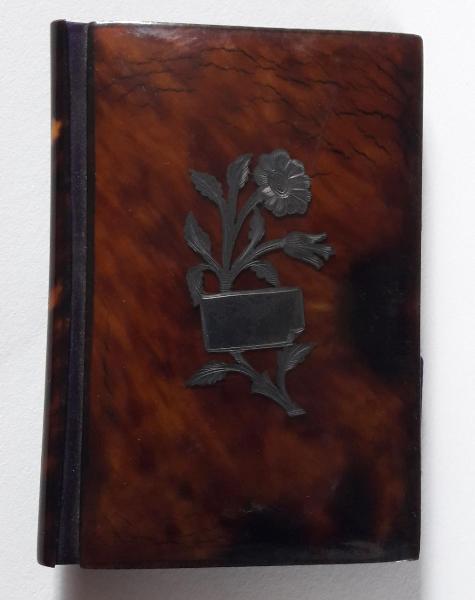 Coperta in tartaruga, sul fronte inserto in lamina d'argento con motivo decorativo floreale e cartiglio. Racchiude una piccola agenda, un vano e porta penna o matita, rivestimento interno in seta color viola.\n. \n