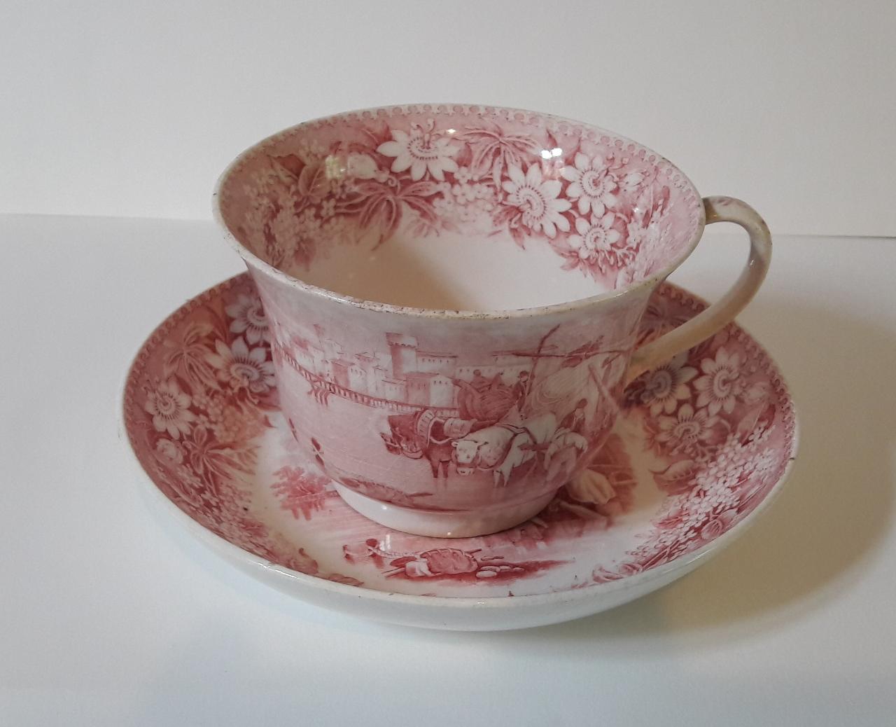 Serie di quattro di tazze da thè con relativo piattino, decorate con la tecnica della decalcomania, con motivi decorativi floreali e scorci di paesaggi animati.
