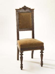 - NOTIZIE STORICO CRITICHE Le poltroncine richiamano nei motivi decorativi geometrici e floreali alcune cornici di stampe presenti nella casa (si vedano le schede S, codice IDK: SWDI1-00022, SWDI1-00023, SWDI1-00036 a SWDI1-00038, SWDI1-00045) e la vetrina presente nel Salotto al piano terra (si veda la scheda OA, codice IDK: SWDI1-00274).\nLe lettere intrecciate "M" e "G" presenti nella cimasa dello schienale potrebbero riferirsi a Giuseppe Ercole Macchi (1863-1923), nonno paterno di Maria Luisa.\n\nStile umbertino: Il nome di questo stile lo si deve al regnante dell'epoca Umberto I nominato Re del Regno d'Italia il 9 gennaio 1878 ed assassinato il 9 luglio 1900.\nLo stile umbertino è tipicamente italiano ed appartiene a quel periodo eclettico che contraddistinse la seconda metà dell'800; durato poco meno di un ventennio, lo stile umbertino si diffuse verso il 1880 e terminò verso il 1895 quando subentrò un nuovo stile chiamato Liberty ed universalmente conosciuto come l'Art-Nouveau a cui farà seguito l'Art-Decò.\nIn questo stile, prevalentemente eclettico e monumentale, vennero riproposti nei mobili, dal comodino al grande armadio o credenza, elementi gotici e barocchi appartenenti in origine al rinascimento ma anche adorni con mascheroni di grandi dimensioni, cornici e decorazioni.