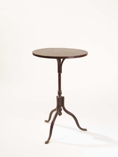 Coppia di tavolini in ferro battuto verniciato in color marrone, con piano d'appoggio tondo, basamento a forma di tripode.