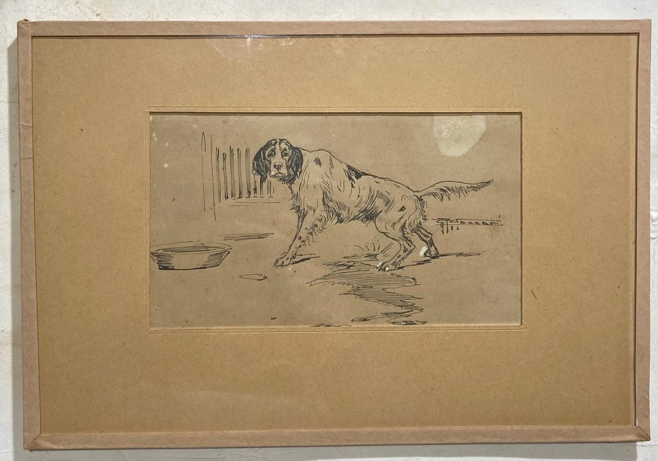 Disegno a inchiostro nero e tempera bianca, con passepartout in cartoncino al recto, montaggio all'europea.\nRaffigura in primo piano un cane da caccia rivolto verso un possibile osservatore esterno all'opera; accanto a lui è presente la ciotola per il cibo e l'acqua. \n