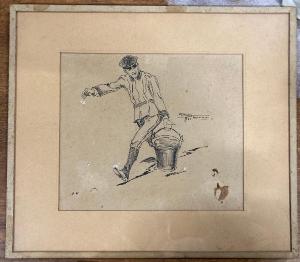 Disegno a inchiostro e tempera bianca, con passepartout in cartoncino al recto, montaggio all'europea.\nRaffigura in primo piano una figura maschile che cammina verso sinistra, sorregge con la mano sinistra un secchio. \n