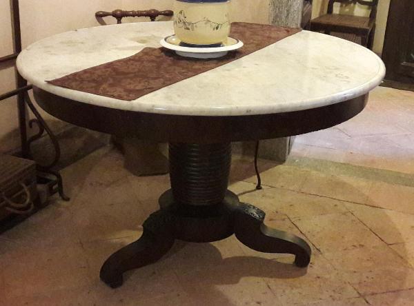 Grande tavolo tondo da centro retto da balaustro a torciglioni terminante con piedi mossi e sagomati ornati con motivi decorativi vegetali a intaglio; piano in marmo con bordo modanato.