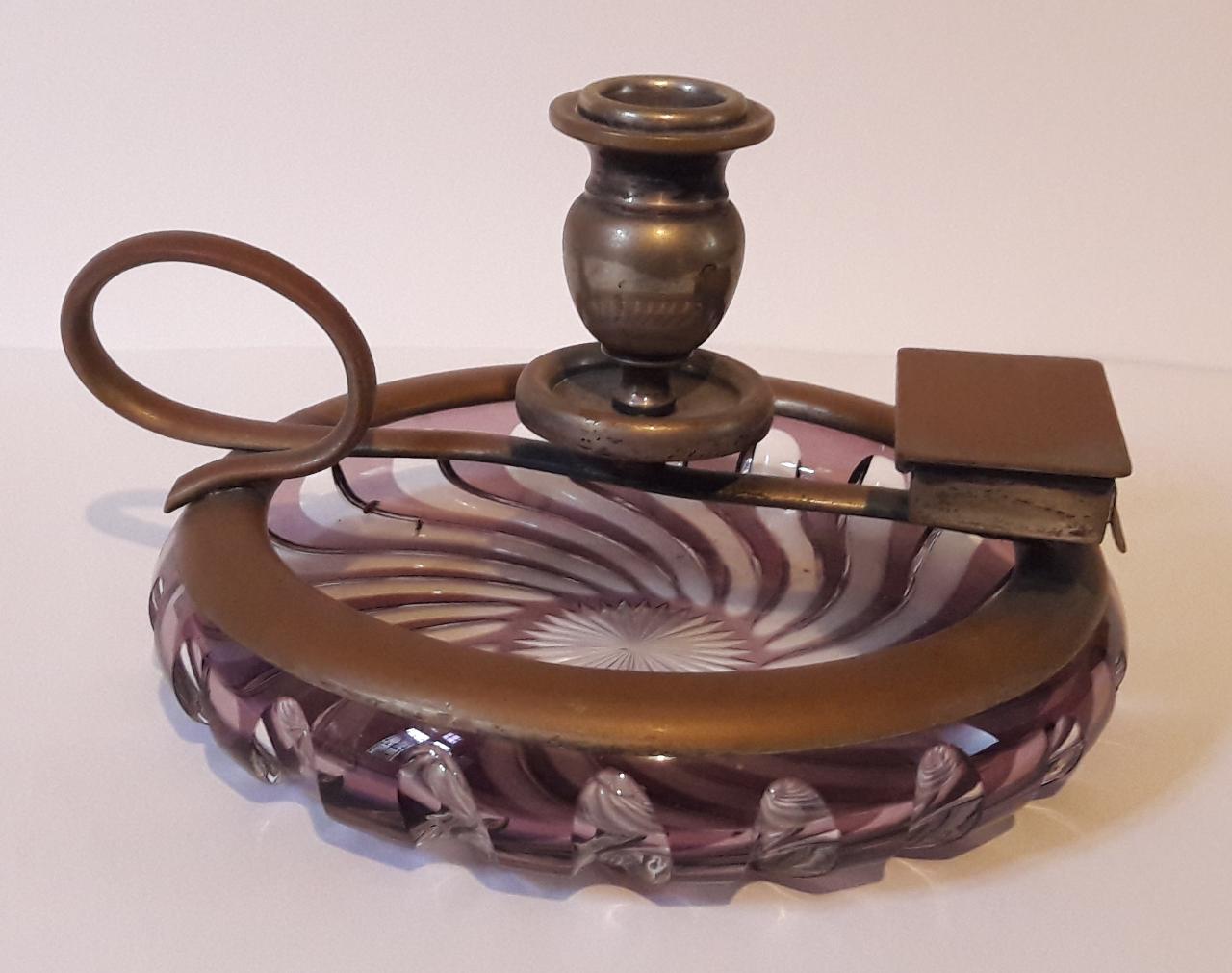 Candeliere basso formato da un piattello in cristallo molato e sfaccettato con motivo a torchon, manico e bocciolo in metallo in cui si infila la candela. Piccola scatola con coperchio apribile in cui riporre i fiammiferi.\nIl manufatto presenta la patina originale scura del tempo.