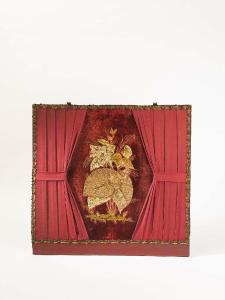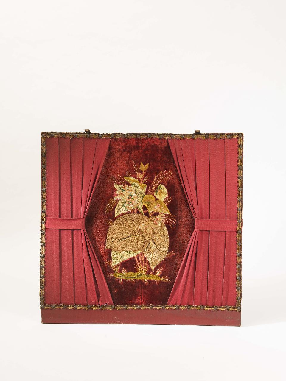 Il paracamino in raso presenta un bel ricamo con fili colorati e dorati su un fondo di velluto recante motivi decorativi vegetali. Il pannello in tessuto è fissato mediante delle borchie a un telaio in legno.