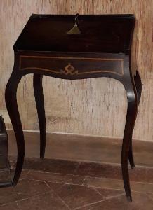 Ribalta da centro impiallacciata e finemente intarsiata con profilature e specchiature sagomate; gambe lunghe e arcuate, piano apribile con cassettini all'interno.\nLa struttura in generale si presenta leggera ed armoniosa.