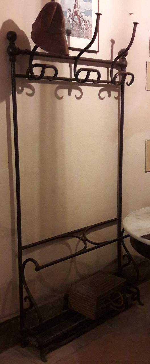 Attaccapanni da parete in ferro verniciato color marrone, munito di tre appendini per gli abiti e i cappelli. Nella parte inferiore, scomparto con relativa vaschetta per la raccolta dell'acqua: serve per riporre gli ombrelli. Nei vari elementi che compongono il manufatto predomina la linea curva.