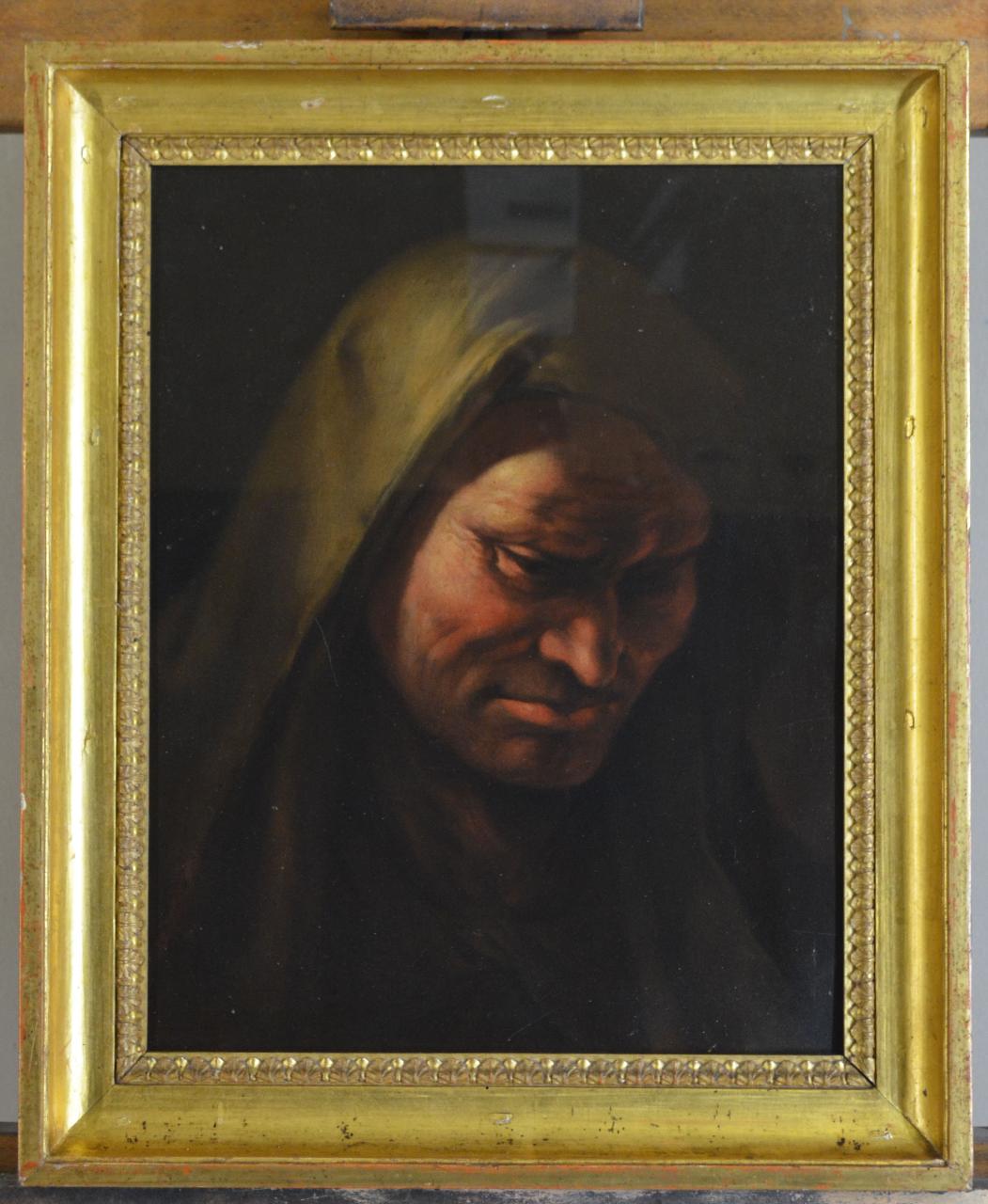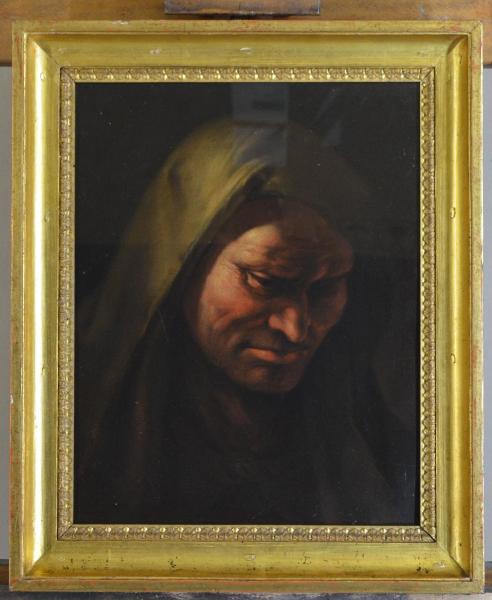 Dipinto realizzato ad olio su tela, adeso a pannello in legno.\nCornice in legno modanato e dorato.\nRaffigura un ritratto d'uomo con copricapo preso di 3/4, emerge da un fondo scuro e compatto; il soggetto occupa quasi per intero lo spazio messo a disposizione per la rappresentazione. Predominano tonalità calde di colore, contrasti chiaroscurali violenti che sottolineano la plasticità dei tratti fisionomici del volto.\nIl dipinto presenta una qualità e un piglio naturalistico di notevole forza espressiva, crudezza con cui è indagato il volto dell'effigiato, reso quasi iperrealistico dal taglio di luce.