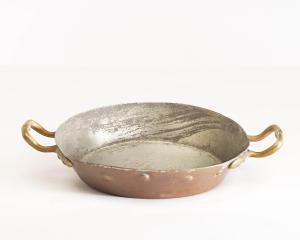 Tegamino in rame di forma tonda con manici in ottone. Le impugnature sono fissate al corpo della pentola mediante rivetti; all'interno risulta stagnata.
