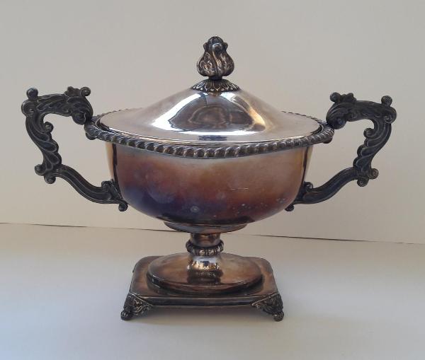 Zuccheriera in metallo argentato con piedini e prese a volute fogliacee; base quadrangolare sulla quale poggia il piedistallo circolare, corpo ovale liscio con bordo superiore ornato con lavorazione a torchon; coperchio con presa a pomolo.