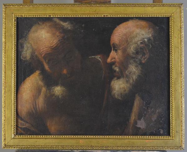 Dipinto realizzato a olio su tela, entro cornice in legno modanato e dorato.\nDa un fondo scuro e uniforme emergono in primo piano i ritratti di due uomini anziani, raffigurati in pose differenti, che occupano quasi l'intero spazio messo a disposizione per la rappresentazione. Predomina la massa del colore dalle tonalità calde e non la linea di contorno nella definizione dei vari elementi dei volti; un colore steso attraverso pennellate veloci, contrasti tra luci e ombre. Morbidezza nella resa della barba e dei ricci capelli, un realismo intenso pervade l'intero soggetto dell'opera. Traspare una profonda e intima ricerca espressiva dei personaggi ritratti: uno parla pacatamente e l'altro ascolta, un dialogo nutrito da complicità e rispetto.