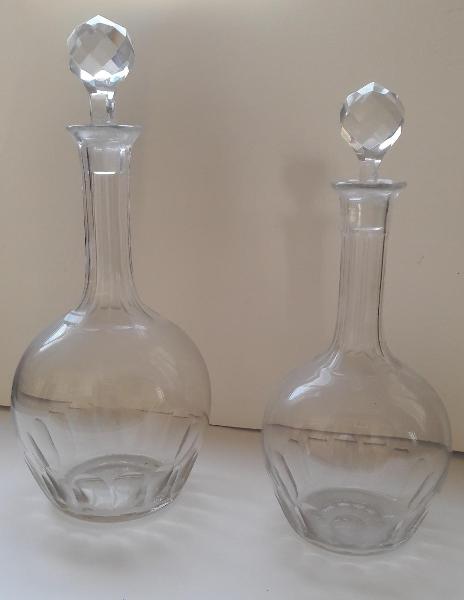 Insieme di quattro bottiglie in cristallo molato con tappo sfaccettato.\n\n\n
