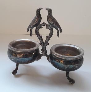 Saliera in metallo fuso e argentato poggiante su piedini curvi terminanti a zampa di leone, due contenitori circolari per il sale muniti di vaschette interne in vetro, presa centrale terminante nella parte superiore con due uccelli affrontati.