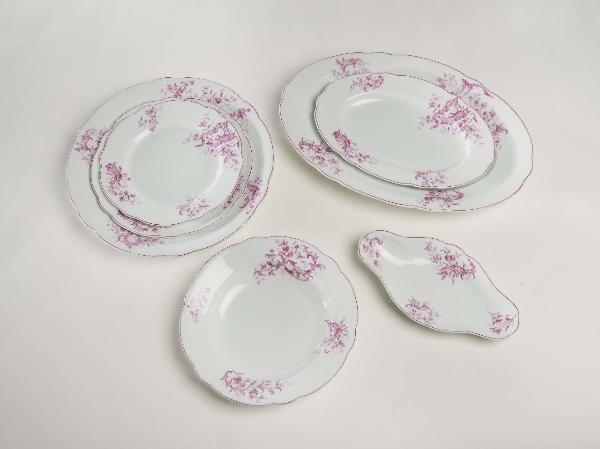 Servizio da tavola in fine porcellana bianca ornato con motivi decorativi floreali e vegetali (motivo a rocaille in "camaieu rose"), realizzati con la tecnica della decalcomania ritoccata a mano e a piccolo fuoco.\nI vari pezzi hanno bordi polilobati, alcuni presentano la cifra relativa alla produzione seriale. \nIl servizio è composto da: 10 piatti fondi, 47 piatti piani, 24 piattini da dolce, 1 zuppiera, 2 salsiere con relativi cucchiai, 1 terrina, 2 alzatine (cm. 15.7 x 23.5 ca.), 2 alzatine (cm. 7.5 x 23.5 ca.), 1 vassoio da portata ovale (cm. 45 x 31), 4 raviere, 2 piatti da portata tondi, 2 vassoi da portata ovali (cm. 40 x 26.5), 2 vassoi da portata ovali (cm. 28.8 x 19), 1 vassoio da portata ovale per il pesce.\n