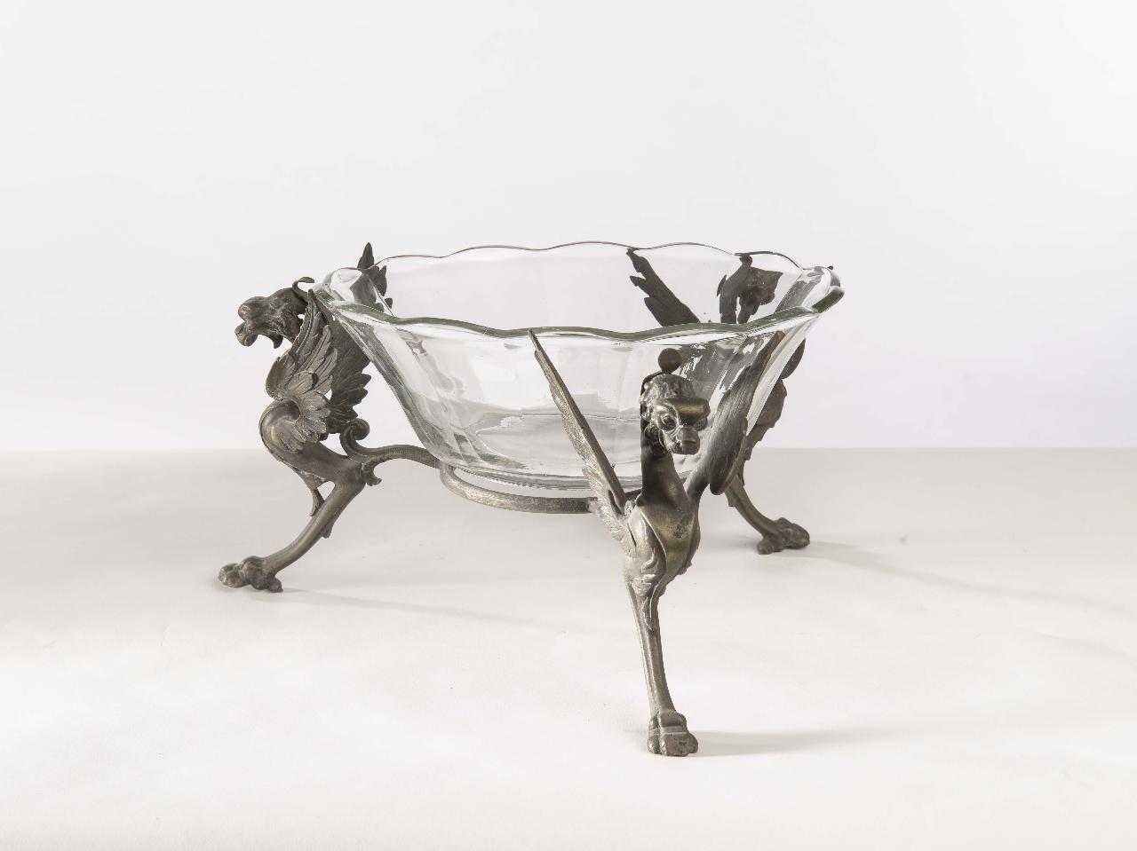 Centrotavola con struttura portante in metallo fuso, poggiante sulle zampe ferine di tre figure di drago con ali spiegate e bocca aperta. Al centro, internamente, ciotola in cristallo sfaccettato e molato, con bordo ondulato.