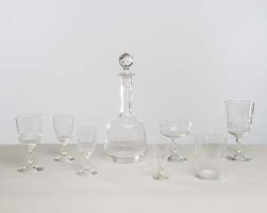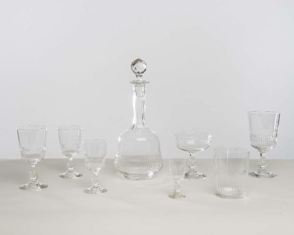 Servizio di bicchieri a calice in cristallo molato, con piede circolare, stelo e coppa sfaccettata, composto da: 11 bicchieri per l'acqua, 10 bicchieri per il vino rosso, 8 bicchieri per il rosolio, 12 coppe per lo champagne, 9 bicchieri per il vino bianco, 8 bicchieri per il liquore, 10 bicchieri per lo whisky, 2 bottiglie grandi prive di tappo e 3 bottiglie leggermente più piccole col tappo.\n\n