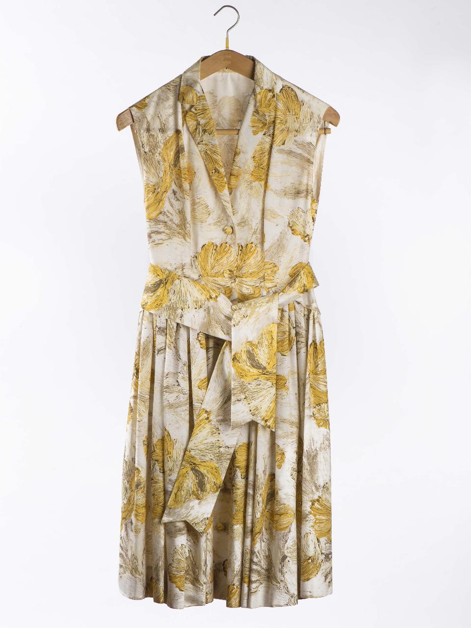 Abito femminile da sartoria senza maniche per la stagione estiva, in cotone stampato, abbottonato sul davanti, corredato dalla sua cintura en pendant.\n\n