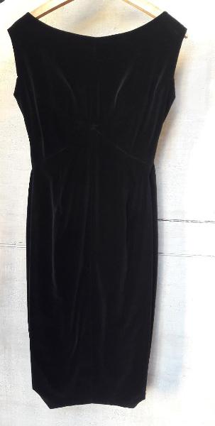 Abito femminile da sartoria senza maniche, in velluto nero; sul retro chiusura con cerniera e fiocco decorativo in seta.\n\n