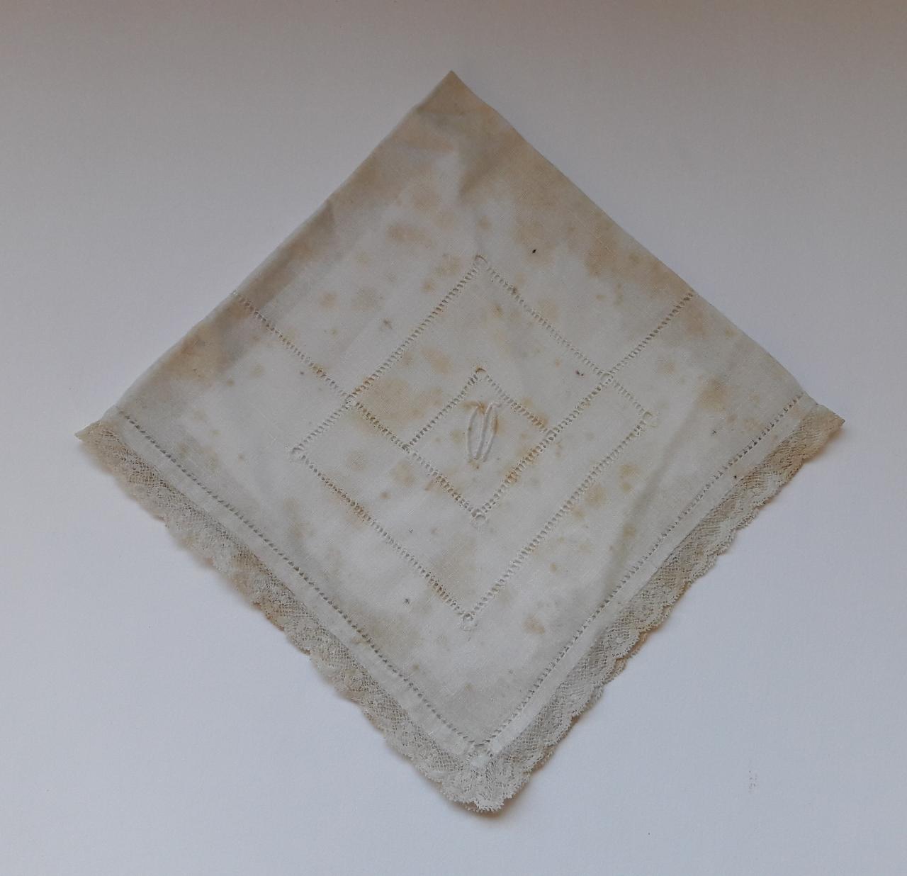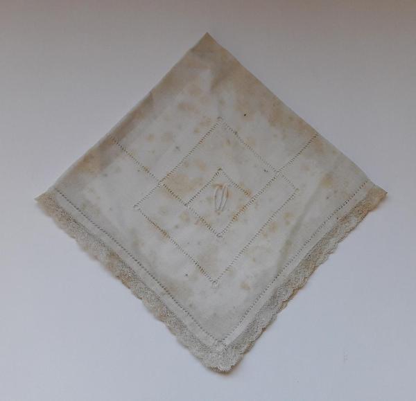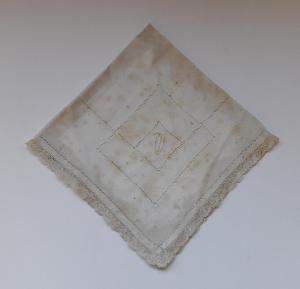- NOTIZIE STORICO CRITICHE La lettera "M" ricamata sul fazzoletto potrebbe riferirsi al cognome della mamma di Maria Luisa Macchi, Leonilde Anna Caterina Monti (1897-1979), oppure al nome della bisnonna di Maria Luisa, Maria Colombo, infine al cognome Macchi.