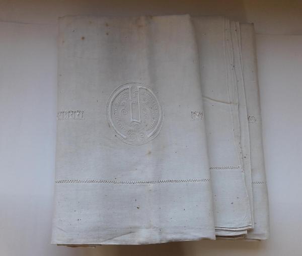 Lenzuolo matrimoniale sopra completo di due federe per cuscini in lino ricamato a mano. Sull’intera fascia del risvolto del lenzuolo: lavorazione orlo a giorno, motivi decorativi floreali a intaglio, iniziale "M" ricamata al centro con ai lati due figure di angeli ricamati a intaglio. Sulle federe, lavorazione orlo a giorno e iniziale "M" a ricamo.\n