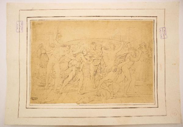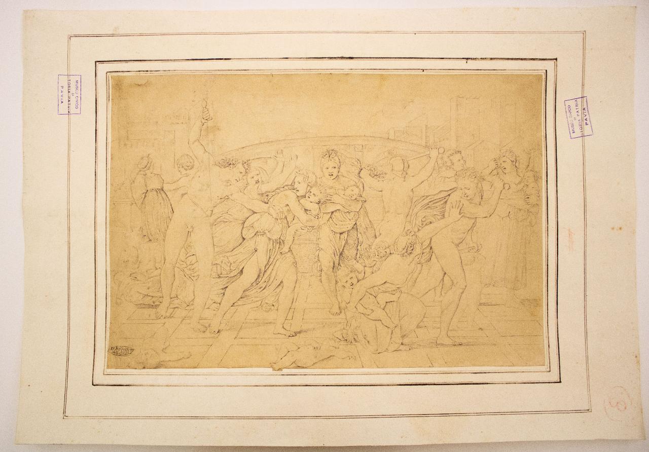 - NOTIZIE STORICO CRITICHE L'opera deriva da un' invenzione di Raffaello, l'incisione di Raimondi è da datare al 1511. \nDella stessa esistono due versioni, una "con falcetta" (considerata la prima versione) e l'altra senza, esse si distinguono dalla presenza di un arbusto in alto a destra del foglio. \nMalaspina possedeva le versioni di entrambe le stampe (St. Mal. 1711-12-13-14-15) nonché la lastra di rame con falcetta, tutte conservate oggi presso i Musei civici di Pavia (St. Mal. 5436). \nCon il Giudizio di Paride, il Quos Ego e il Morbetto, l'opera rappresenta uno dei capolavori attestanti la proficua collaborazione tra Raffaello e Raimondi.\nRaffaello della stessa realizzò diverse versioni, due delle quali si conservano al British Museum di Londra, altre al Windsor Castle e all'Albertina di Vienna; infine un ultimo disegno si conserva presso lo Széptmüveszéti Múzeum di Budapest ma di quest'ultimo l'attribuzione è ancora incerta.