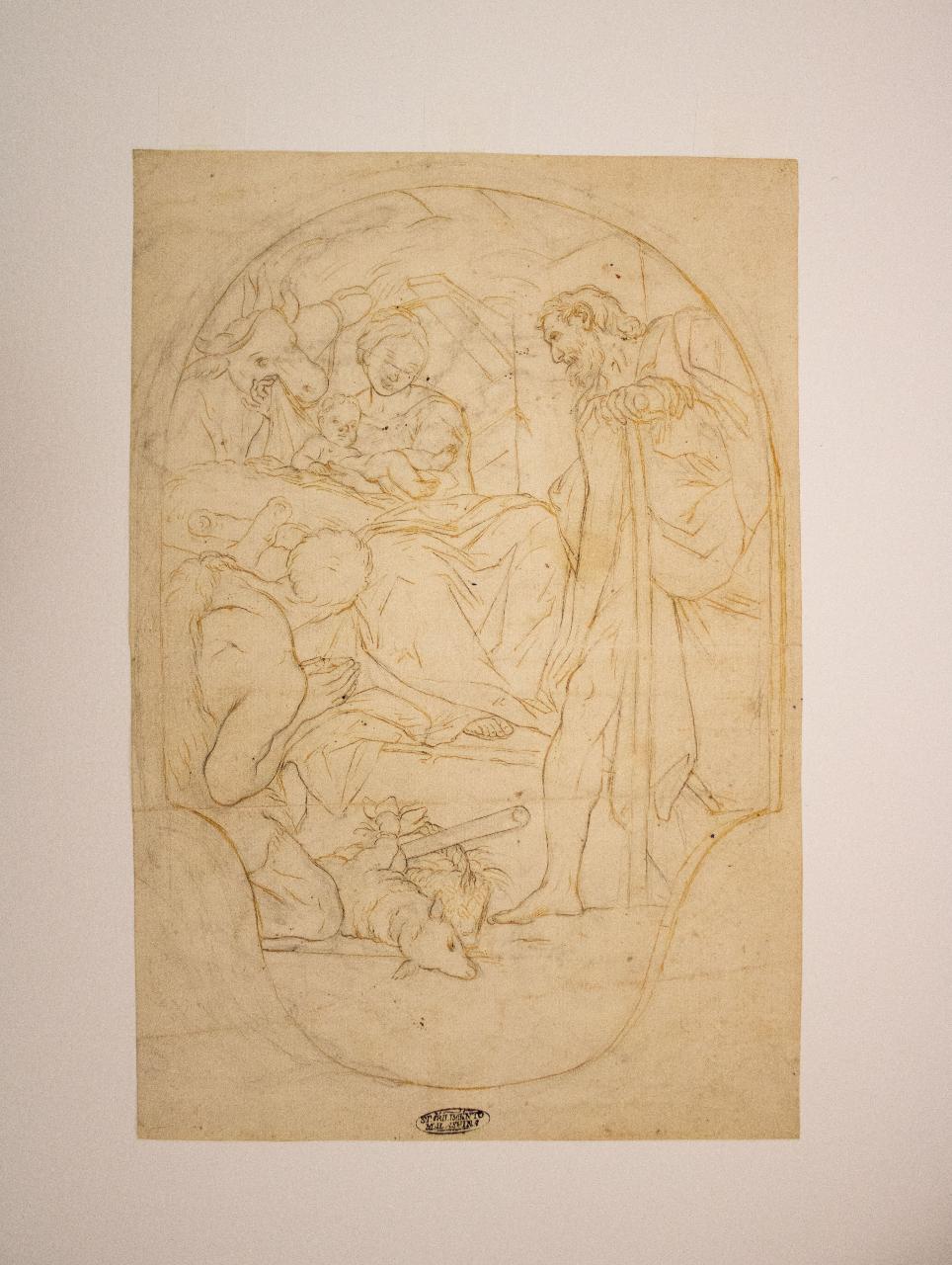 - NOTIZIE STORICO CRITICHE Il disegno, di modesta fattura, mostra una linea rigida e spezzata. L' iconografia parrebbe derivare dalla pala d'altare ubicata nella Cappella Gessi del Santuario della Madonna della Pioggia a Bologna, attribuita al bolognese Agostino Carracci (1557-1602).\nIl Malvasia nel 1686 ne da' una primaria descrizione in Pitture di Bologna: "La bellissima, non mai abbastanza lodata Natività del Signore fu fatta in età di 27 anni da Agostino Carracci, co i due profeti sul volto; e di suo cugino e maestro sono i due mirabili quadretti laterali della Circoncisione, e dell'Adorazione de' Magi, attribuiti ingiustamente, nella stampa che se ne vede fuori, ad Annibale". \nLa tela, fu molto danneggiata durante i bombardamenti della Seconda Guerra Mondiale.\n