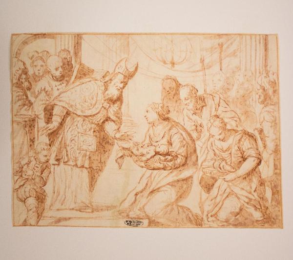 - NOTIZIE STORICO CRITICHE L'episodio è tratto dall'Antico Testamento secondo cui: «Quando furono passati gli otto giorni prescritti per la circoncisione, gli fu messo nome Gesù, come era stato chiamato dall'angelo prima di essere concepito nel grembo della madre. Quando venne il tempo della loro purificazione secondo la Legge di Mosè, portarono il bambino a Gerusalemme per offrirlo al Signore, come è scritto nella Legge del Signore: Ogni maschio primogenito sarà sacro al Signore; e per offrire in sacrificio una coppia di tortore o di giovani colombi, come prescrive la Legge del Signore» (Lc 2, 21-24).\nUna nota manoscritta sul verso attribuisce il disegno a Paolo Veronese, della quale è noto un dipinto oggi conservato alla Gemäldegalerie di Dresda di simile impostazione iconografica.\nIl foglio di discreta fattura potrebbe essere ricondotto all'ambito bolognese o veneziano.