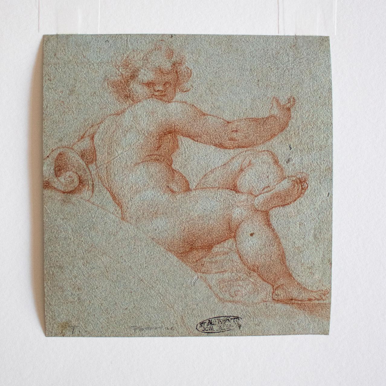Lo schizzo realizzato a matita rossa ritrae un putto seduto di spalle. \nA sinistra si riconosce un elemento architettonico, probabilmente un arco.