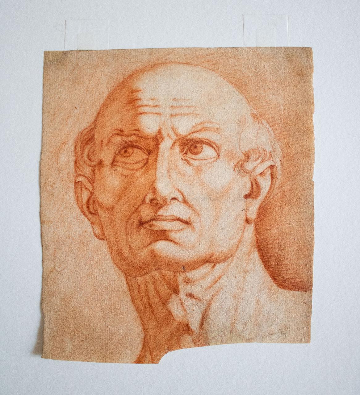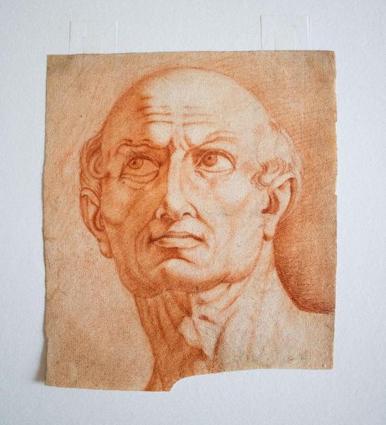 Il ritratto di uomo è realizzato a sanguigna sfruttando le varie tonalità del mezzo grafico. L' uomo virile è rappresentato frontalmente, una parte del volto è oscurata dalle ombre.