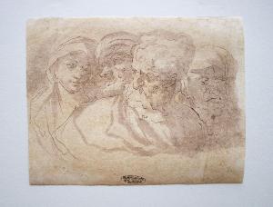 Sul foglio sono ritratti quattro personaggi, tre uomini e una donna di giovane età.\nI volumi sono realizzati attraverso leggere acquarellature e i dettagli dei volti a penna e inchiostro.