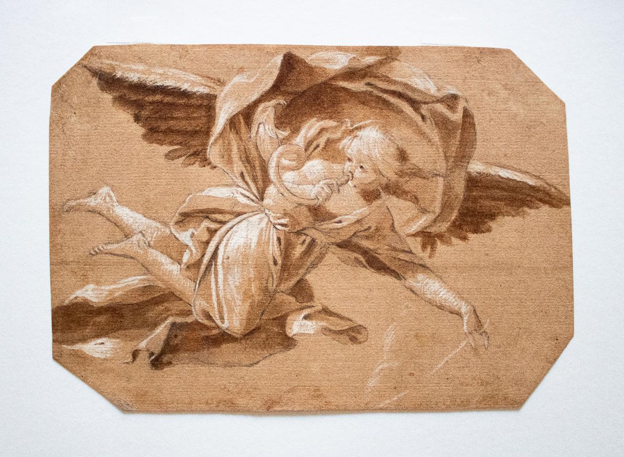 Il foglio ritrae un angelo libratosi in volo mentre suona la tromba del giudizio.\nLe vesti svolazzanti e la delicatezza del tratto grafico contribuiscono a trasmettere movimento e leggerezza.