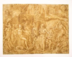 - NOTIZIE STORICO CRITICHE Dell'opera esistono diverse incisioni, una delle quali fu realizzata da Giorgio Ghisi detto il Mantovano intorno al 1555 (St. Mal. 2235), come lo stesso Malaspina indica nel suo Catalogo: «e fra gli accessorj di questa stessa raccolta trovansi un disegno supposto originale della medesima stampa con ancora maggiori variazioni nel fondo, cioè meno lavorato». L'opera del Ghisi presenta tre diversi stati, il terzo è quello che si trova nella collezione Malaspina. Le dimensioni della stampa e del disegno sono molto simili, tra l'altro riprodotte nello stesso. Difatti molti ritengono che il disegno sia stato la base sulla quale il Ghisi lavora. E' bene pero precisare che tra il disegno e l'incisione sono presenti diverse difformità, per esempio nel paesaggio di fondo e nei dettagli dei personaggi. \nInoltre si conoscono altre due incisioni con il medesimo soggetto, una di Marcantonio Raimondi e una di Meldolla e questi hanno riferimenti iconografici comuni con il bulino del Ghisi. \nDal punto di vista stilistico è possibile che il Bertani abbia guardato agli affreschi di Giulio Romano a Palazzo Te, in particolare nella posizione di Paride che ricorda quella di Apollo per le Nozze di Psiche di Giulio Romano. \n\n