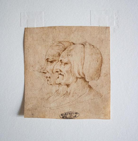 Al centro della scena il foglio presenta un disegno a penna di due figure femminili di profilo. Si tratta di una giovane e una vecchia dai tratti grotteschi e pronunciati.