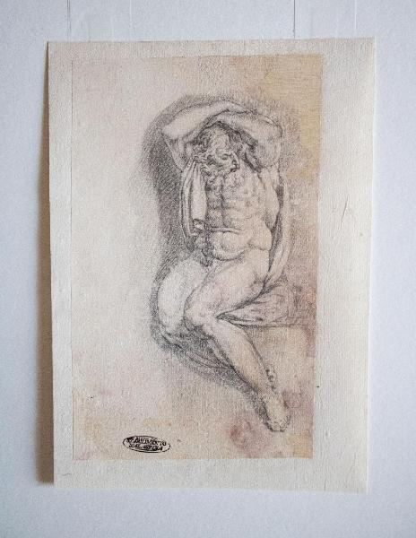 Il disegno a matita rappresenta un uomo nudo, dalla muscolatura particolarmente accentuata dal gioco di luci e ombre mentre si trova seduto con le braccia alzate. L'opera è una copia derivante da Michelangelo.