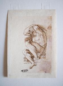 Il disegno a penna e pietra nera rappresenta un uomo nudo seduto con le braccia sopra la nuca. L'opera è una copia derivante da Michelangelo.