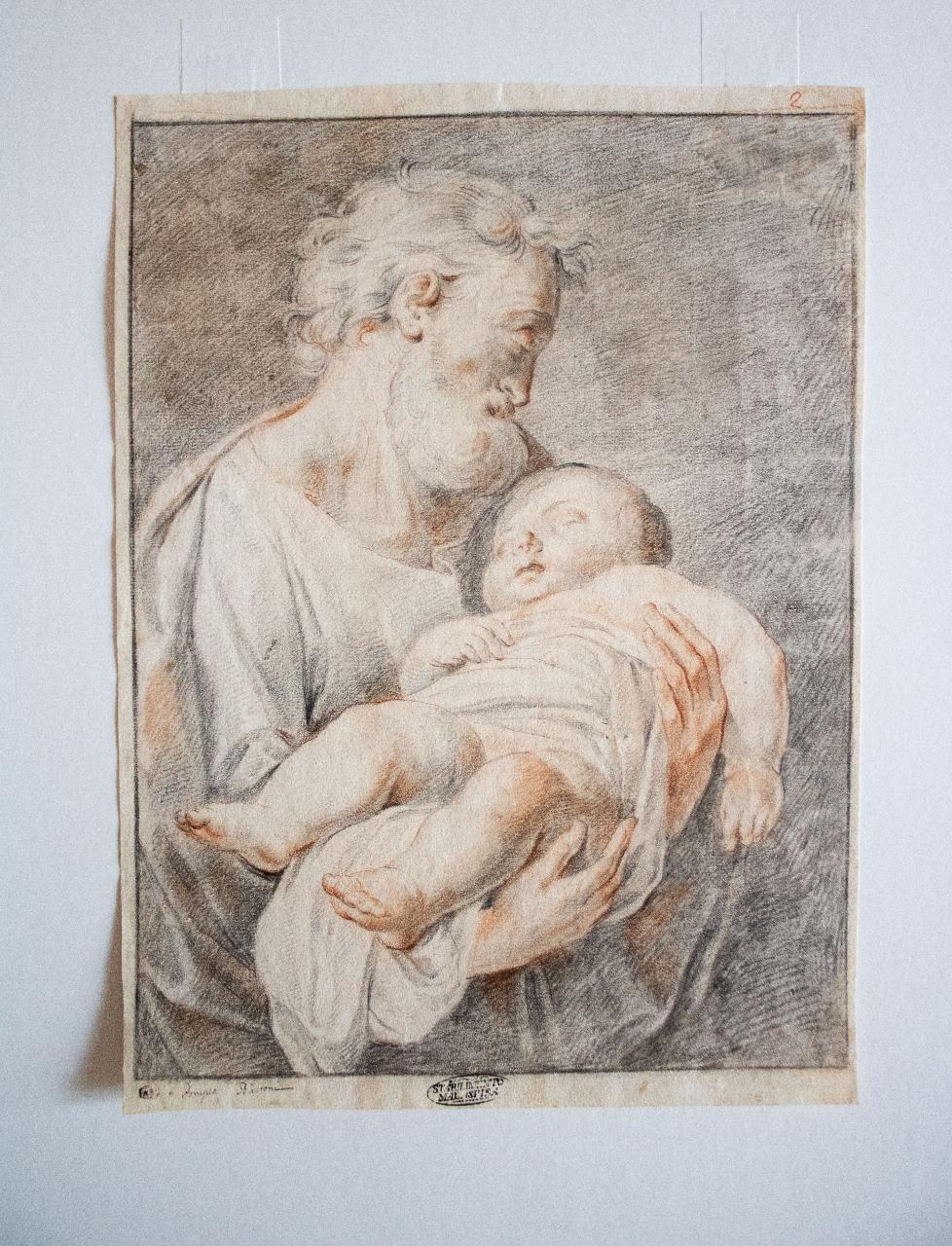 Giuseppe con tenerezza regge fra le braccia Gesù Bambino coperto da una veste bianca. \nGiuseppe è rappresentato di profilo mentre guarda il Bambino dormiente.\nSul verso è presente una controprova con angeli. \nL' opera è realizzata a matita, sanguigna e gesso. \n\n