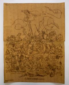 - NOTIZIE STORICO CRITICHE La scena biblica descritta si riferisce all'episodio narrato nel capitolo XXI dell'Antico Testamento. In particolare l'episodio biblico narra che Signore dopo aver punito gli israeliti, comandò a Mosè di fabbricare un serpente di rame/bronzo per guarire coloro che erano stati morsi dai serpenti velenosi.\nTale immagine fu poi utilizzata da Gesù in una conversazione con Nicodemo:\n«E, come Mosè innalzò il serpente nel deserto, così bisogna che il Figlio dell'uomo sia innalzato, affinché chiunque crede in lui abbia vita eterna». (Giovanni 3:14-15)\nDell'opera "Le Serpent d'Airain" sono note diverse stampe facenti parte della serie "Recueil des meilleurs desseins de Raimond La Fage" (Compendio dei migliori disegni di Raimond La Fage), pubblicate dapprima da Jan van der Bruggen (1648/49-1690) e successivamente da Gerard Valck (1651/52 -1726).\nIl disegno, è una copia di mediocre qualità da mettere in relazione alla stampa St. Mal. 4334 della collezione Malaspina conservata presso i Musei civici di Pavia.