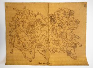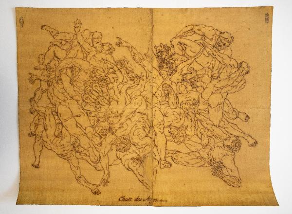 Un groviglio di vigorosi corpi nudi maschili occupano il centro del foglio. La scena rappresenta il momento in cui gli angeli ribelli cadono verso gli inferi così come narrata nel libro dell'Apocalisse.\nIl disegno è realizzato su carta vergata oleata a penna e inchiostro marrone.