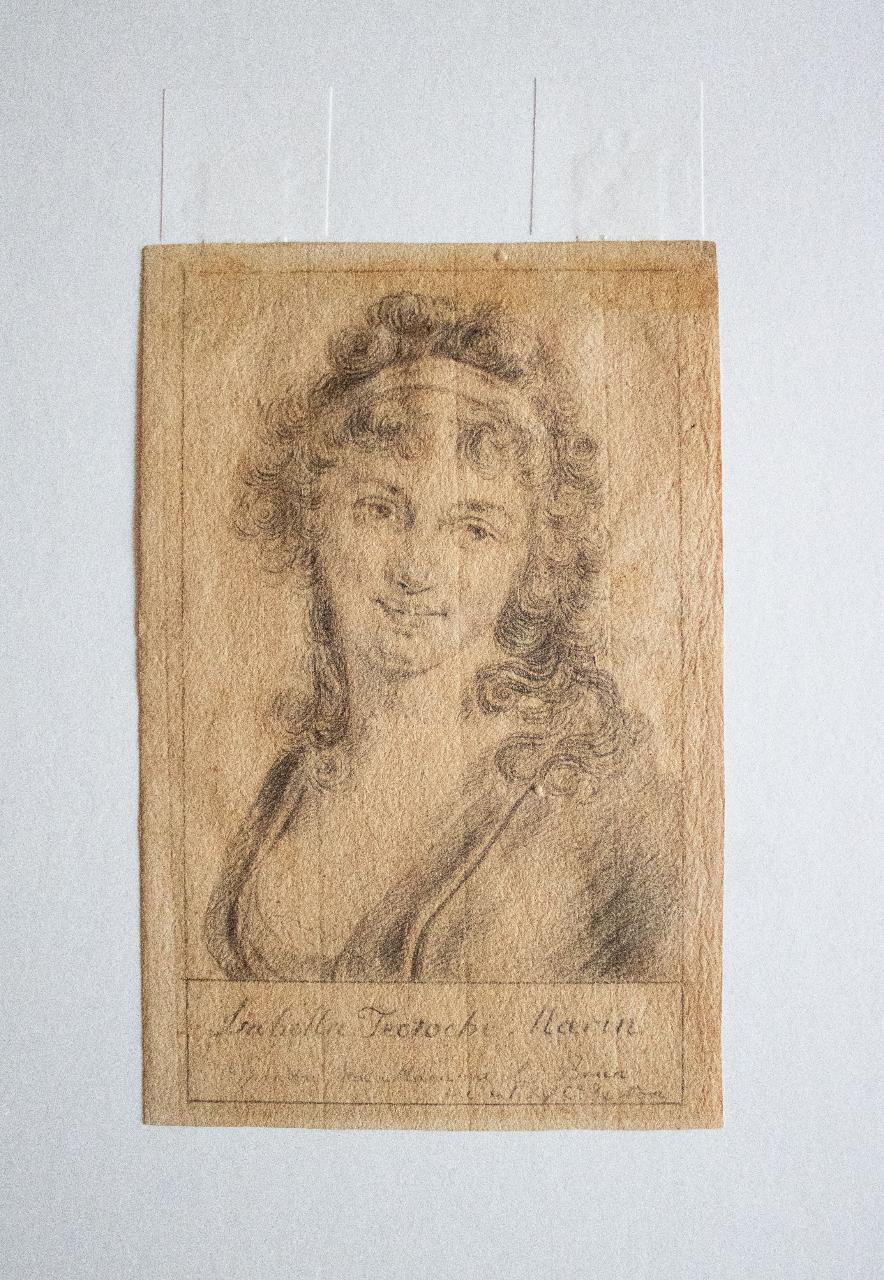 - NOTIZIE STORICO CRITICHE Come indicato dalla didascalia il foglio ospita il Ritratto di Isabella Teotochi Marin, letterata della Repubblica di Venezia. Presso la sua dimora veneziana, ubicata in calle delle Balotte, si tenne uno dei salotti più in voga del secolo, assidui frequentatori furono letterati, scrittori ed artisti tra i quali si ricordano i nomi di Ugo Foscolo e Vincenzo Monti. \nIl disegno pavese è da rimandare al dipinto che ritrae la giovane donna nel 1792 ad opera di Élisabeth Vigée Le Brun (1755-1842), considerata una delle più grandi ritrattiste del suo tempo. \n