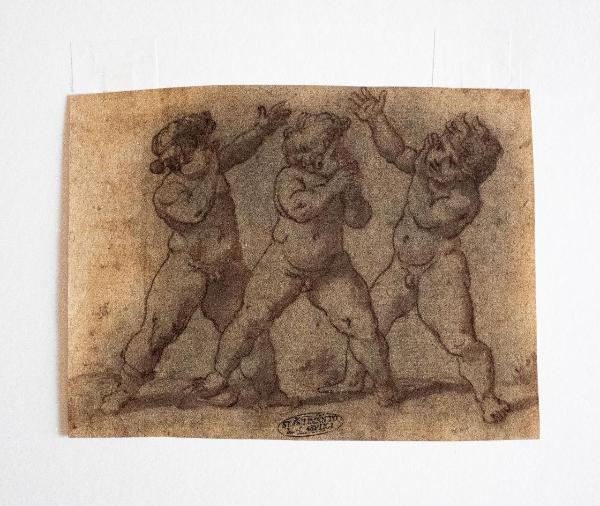 Il disegno, realizzato a penna, ritrae tre putti a figura intera, colti stanti quasi nella stessa posizione delle gambe ma con atteggiamenti differenti. Il primo di sinistra è raffigurato di tre quarti ma rivolto verso destra, quello al centro ha il corpo raffigurato verso l'osservatore ma il busto verso destra, infine l'ultimo rivolto a sinistra è colto nel momento in cui reca la mano all'orecchio quasi a voler sentire meglio le parole dei due compagni.