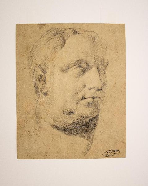 Il foglio realizzato a matita nera ritrae il volto di una figura maschile vista di tre quarti. L' opera potrebbe derivare dalla statuaria classica, forse un imperatore. \nSul retro si riconosce lo studio di un panneggio.\n