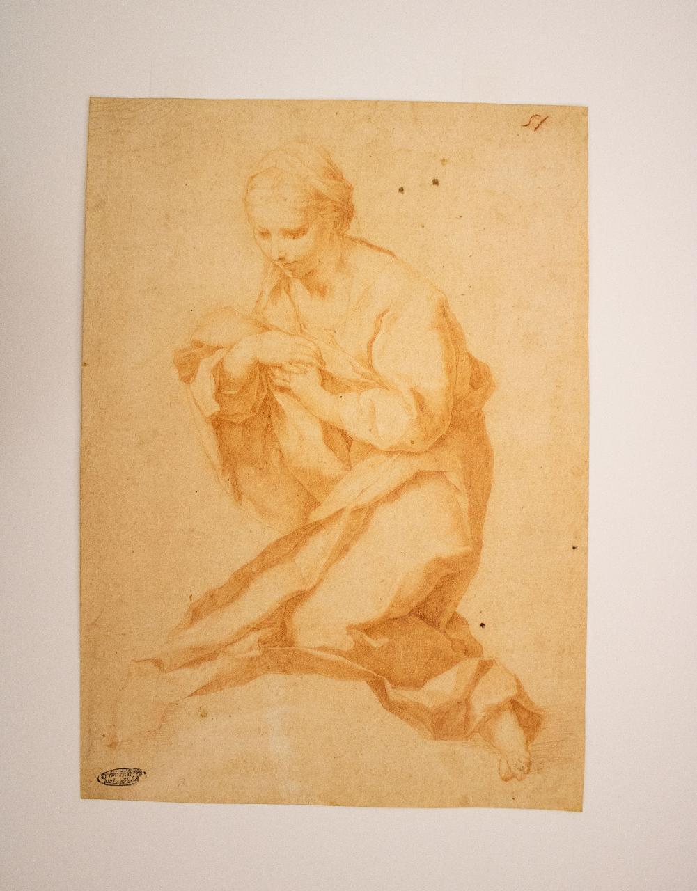Un figura femminile avvolta in lunghe vesti è posta in ginocchio con il capo chino. Le mani raccolgono con delicatezza il panneggio all'altezza del petto.