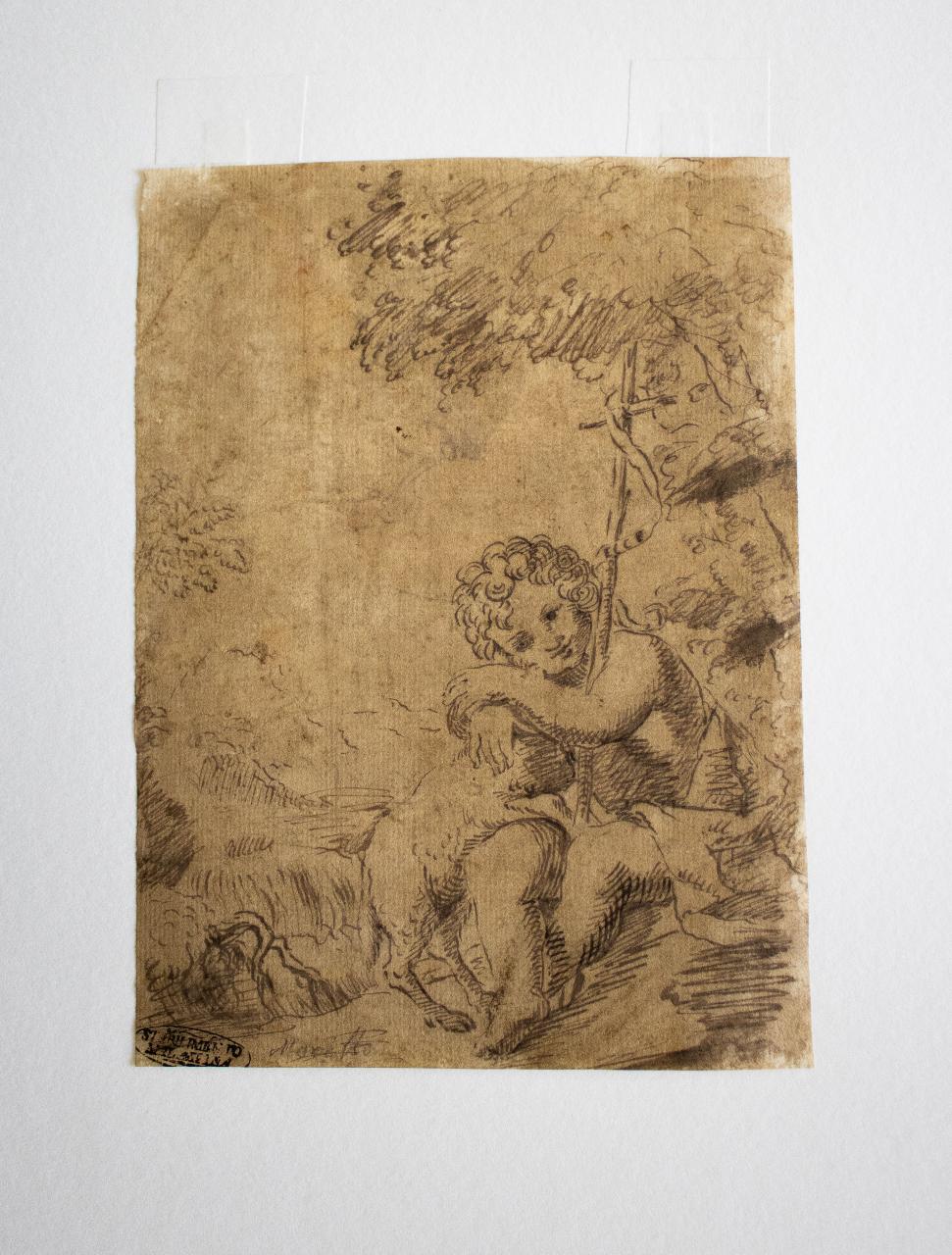 - NOTIZIE STORICO CRITICHE \nPrecursore di Gesù. Sin dalla giovane età comincia l'opera di predica e offre il battesimo in remissione dei peccati. L'iconografia del San Giovannino prende piede sempre di più a partire dal XV secolo. Dapprima inserito nelle composizioni con la Madonna e il Bambino, riceverà poi un'attenzione specifica da parte di committenti e pittori. Nelle opere in cui compare da solo viene spesso raffigurato con l'agnello, simbolo del sacrificio del Messia. Reca con sè in oltre un lungo bastone terminante con una croce. Il cartiglio legato a quest'ultima porta la scritta "Ecce Agnus Dei", la frase pronunciata dal profeta quando incontrò Gesù.\nL'opera, di modesta qualità, potrebbe essere una copia da una composizione non ancora individuata.