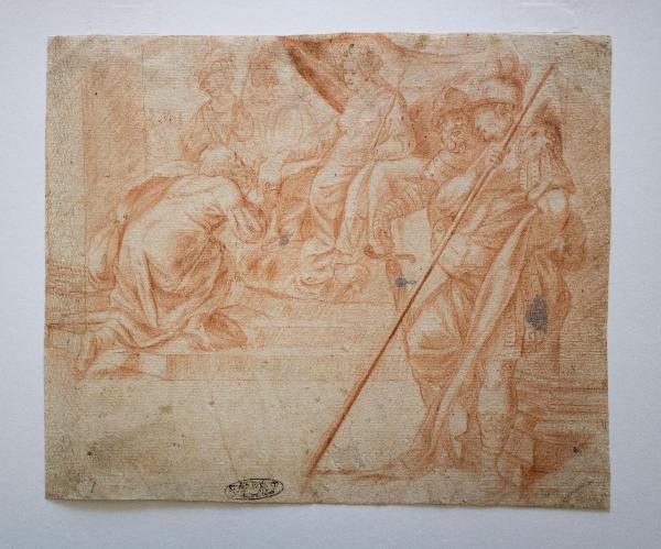 RECTO: Assisa su un trono vi è una regina che accoglie la supplica scritta di una figura panneggiata di vecchio in ginocchio. La composizione è completata sia sullo sfondo che sulla destra in primo piano da alcuni soldati armati di lance e spada.\nVERSO: In alto al centro sono abbozzati in modo schematico i connotati di un volto