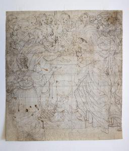 - NOTIZIE STORICO CRITICHE \nIl disegno, tipico dello stile del Chiaveghino, è lo studio preparatorio per l'omonimo dipinto eseguito nel 1600 nella Cappella del Sacramento del Duomo di Fidenza. Rispetto alla tela il foglio manca della parte superiore, in cui si sviluppa la spazialità della scena, inserita all'interno di un'architettura con il punto di fuga centrale e inquadrata da due colonne ed un arco nel fondo.