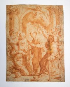 - NOTIZIE STORICO CRITICHE \nIl disegno di scadente fattura è una copia dall'incisione di Francois Perrier (Salins 1590 ca - Parigi 1650) raffigurante la "Comunione di San Girolamo". L'acquaforte dell'artista francese riproduce in controparte la pala omonima realizzata da Agostino Carracci tra il 1592 e il 1597 per la chiesa di San Girolamo alla Certosa a Bologna e tutt'oggi quivi conservata presso Pinacoteca Nazionale della stessa città.