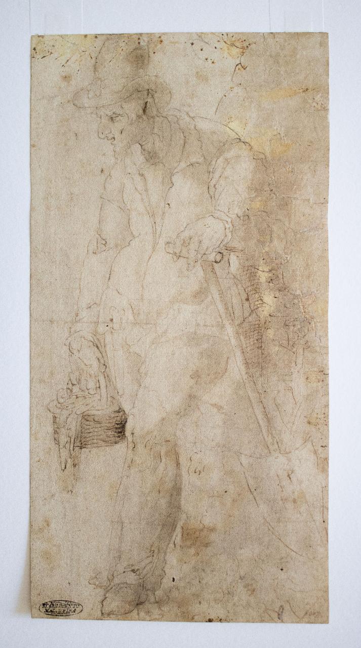 RECTO: Rivolto verso sinistra, una figura maschile stante, vestita di stracci logori e con indosso un cappello con tese, si appoggia al manico di un badile mentre con l'altra mano reca un cestino di vimini dal contenuto non ben definito.\nVERSO: Sono presenti dei veloci schizzi non ben identificabili.