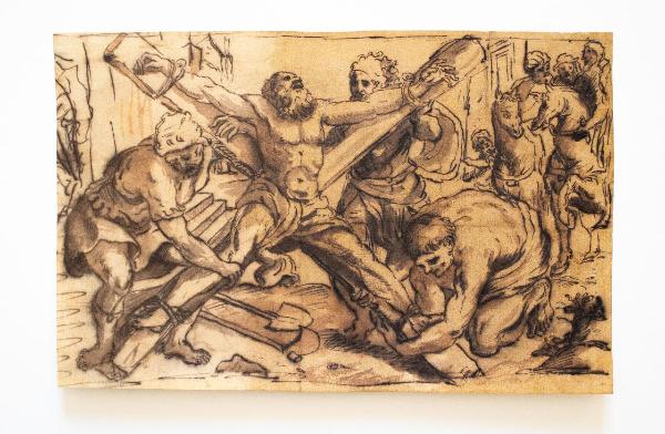 Al centro una figura di anziano seminudo viene assicurato ad una croce da tre personaggi. Due sono intenti a legare le gambe mentre il terzo sorregge la pensate croce. Ai loro piedi si scorgono una vanga ed un badile. Sulla destra in secondo piano un drappello di figure a cavallo sembrano conversare tra di loro mentre una figura a piedi li osserva.